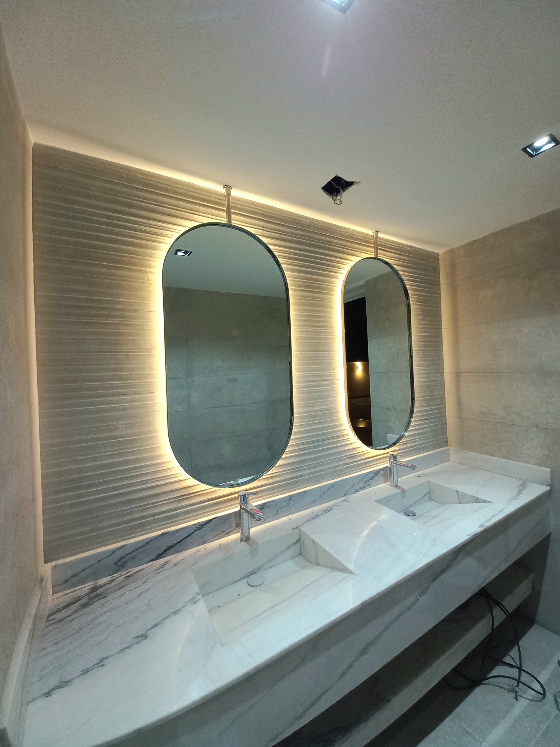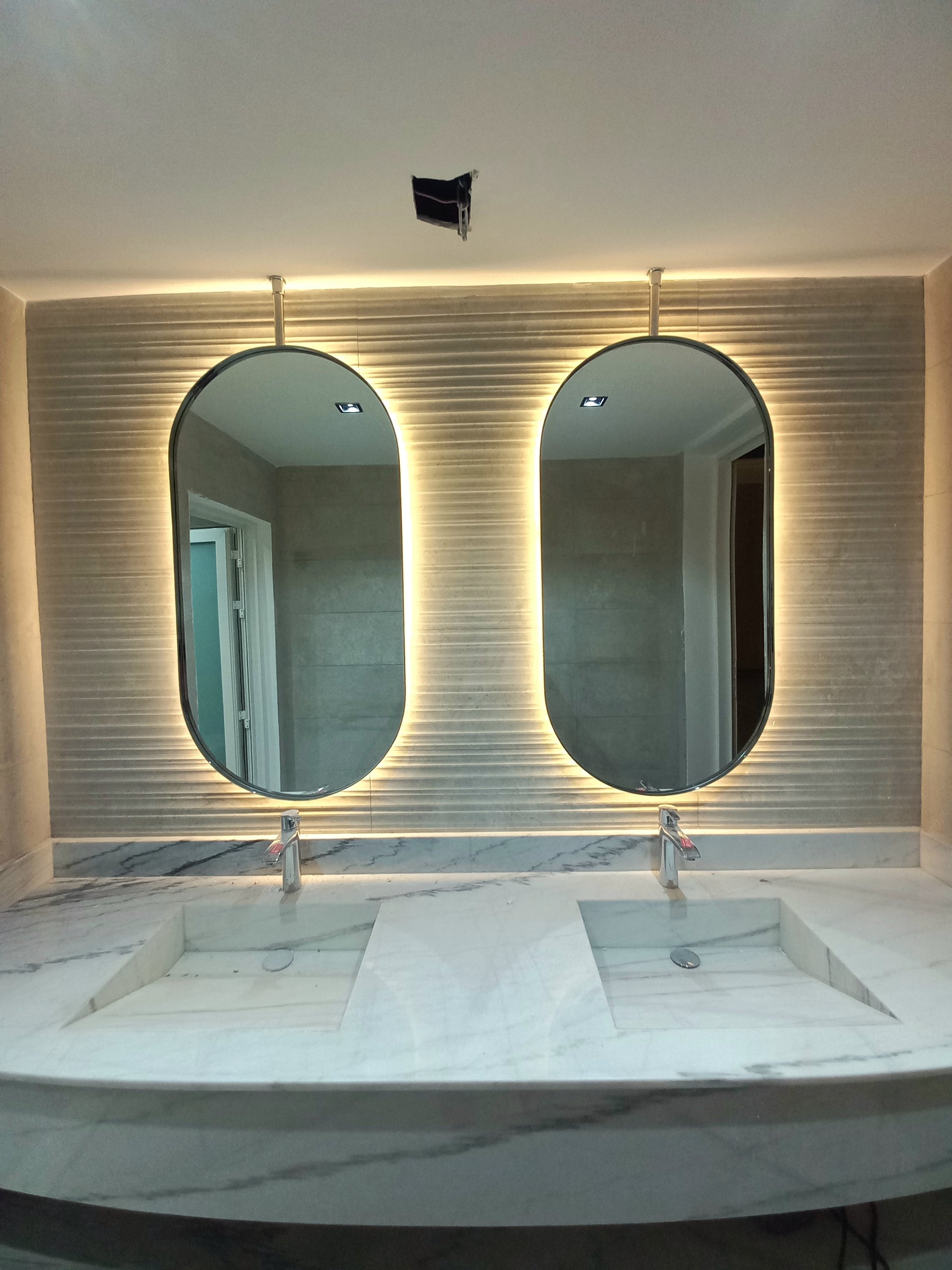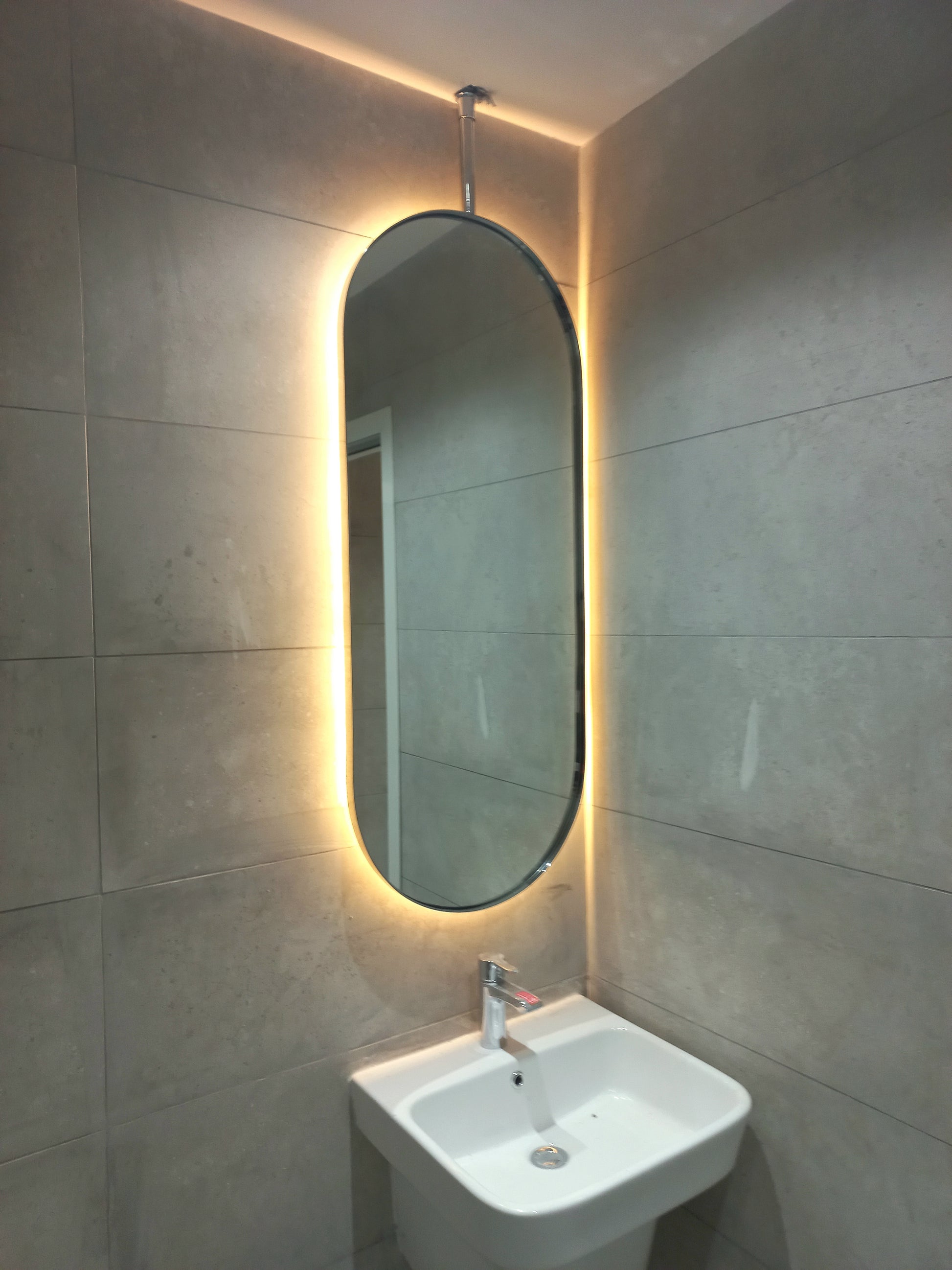 Ain mirror made of 6mm thickness Belgium mirror Double coat backing with high quality stainless steel solid frame 25x5mm thick with electroplating color. the mirror includes backlit 3000k warm white with hanging place in the back.