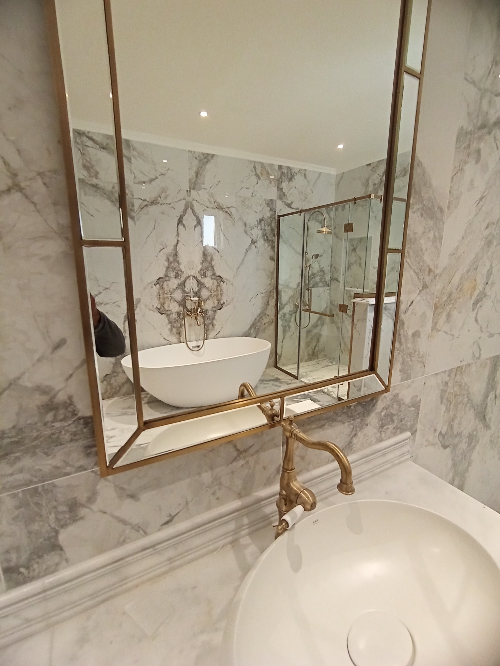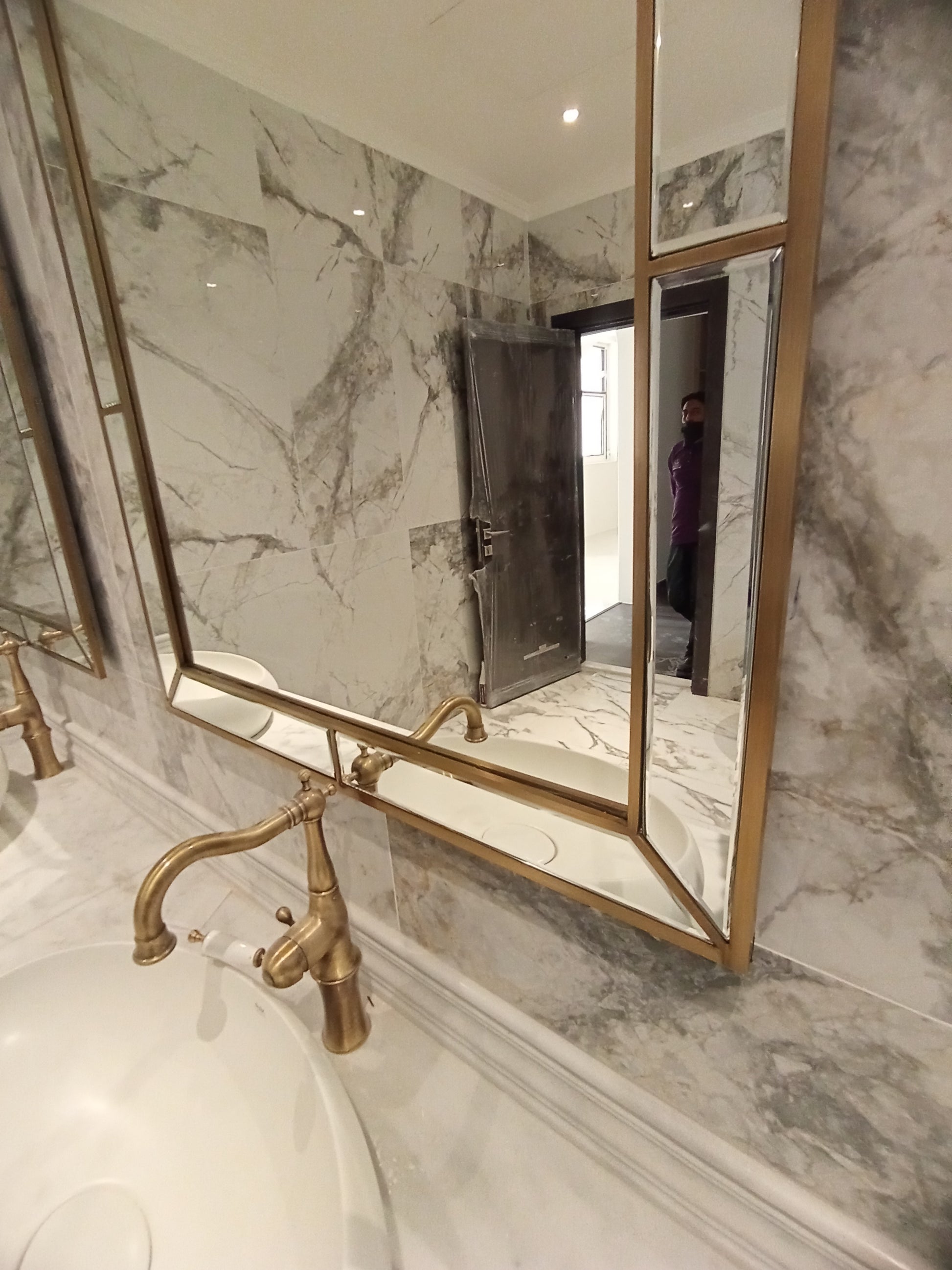 Aseel mirror made of 6mm thickness Belgium mirror Double coat backing with high quality stainless steel solid frame 25x5mm thick with electroplating color.the mirror includes backlit 3000k warm white with hanging place in the back.