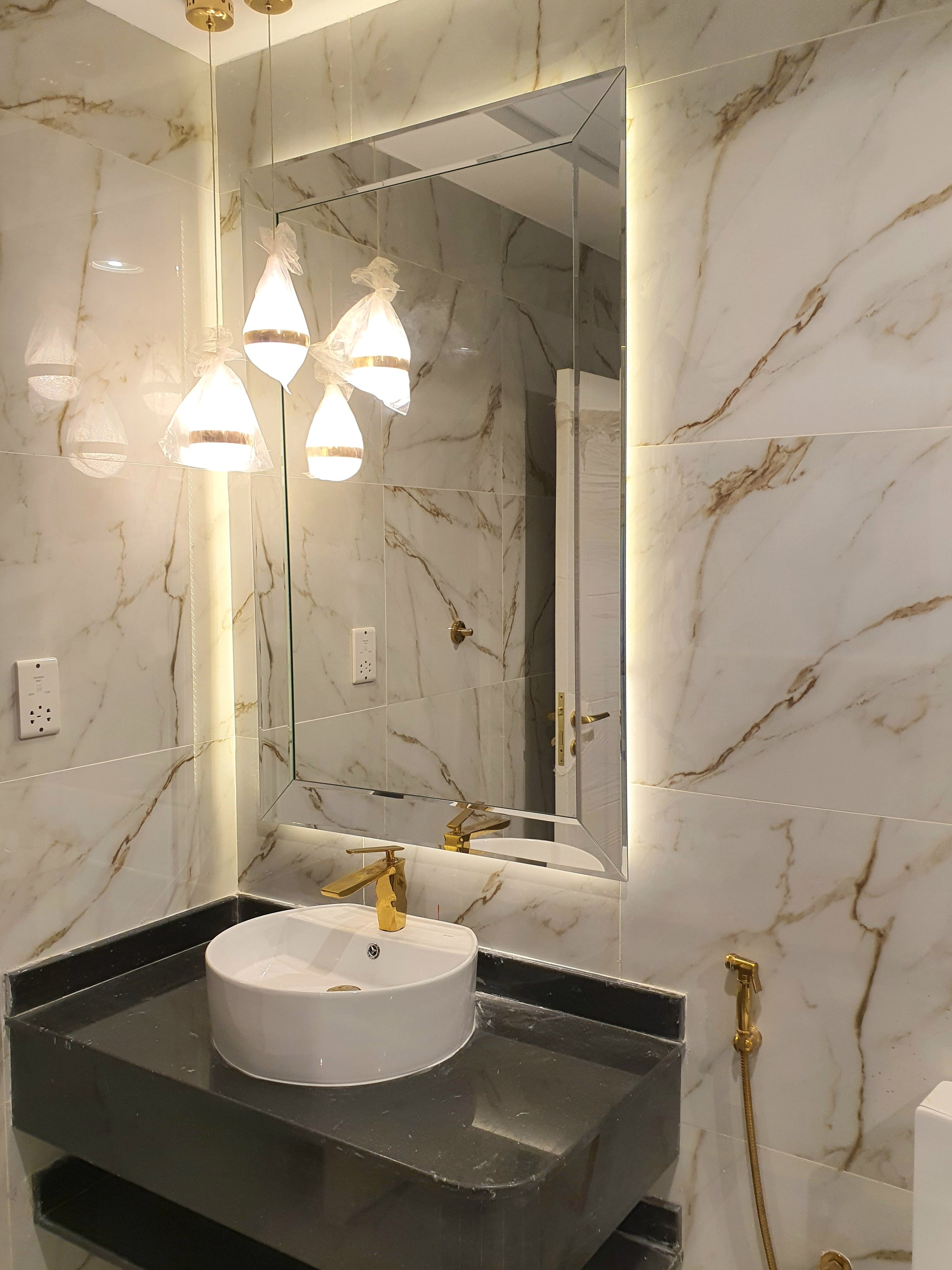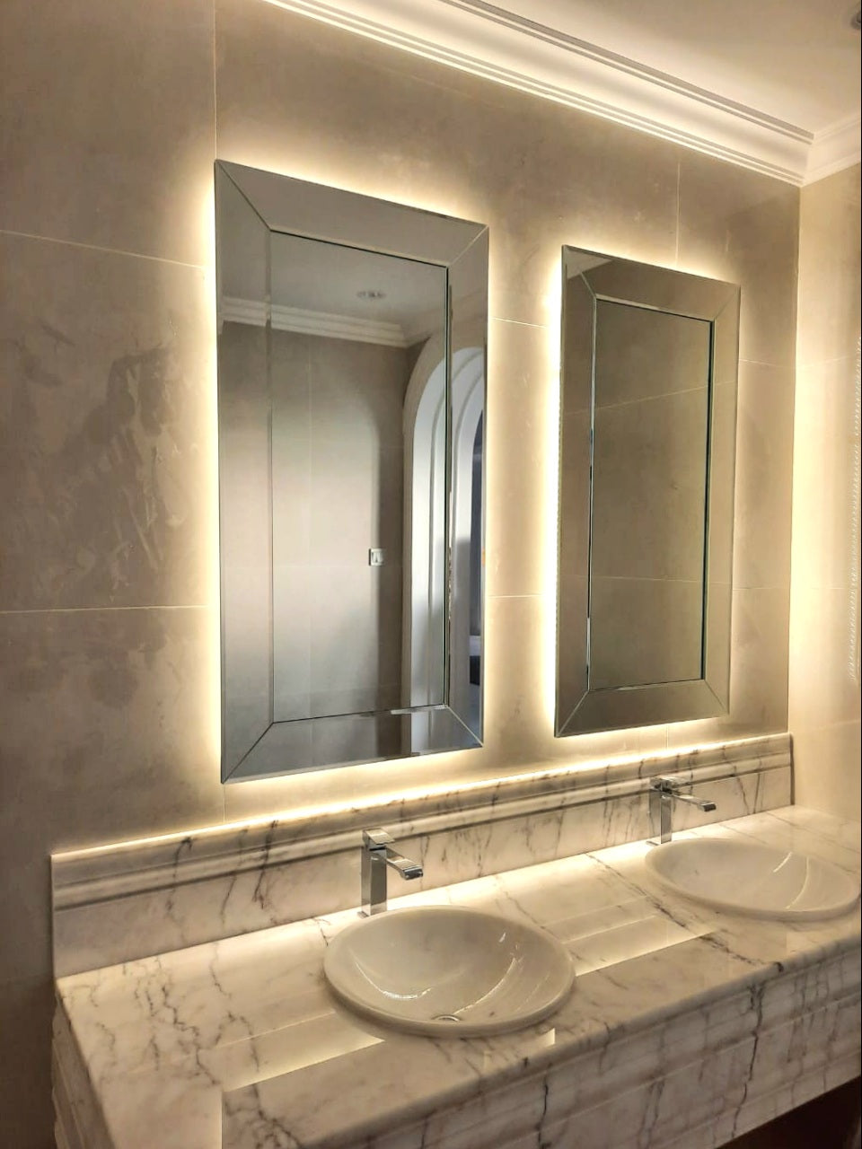 Casablanca mirror made of 6mm thickness Belgium mirror Double coat backing. the mirror includes 3000 backlit warm white with hanging place in the back. It is made of four sides mirror frame.