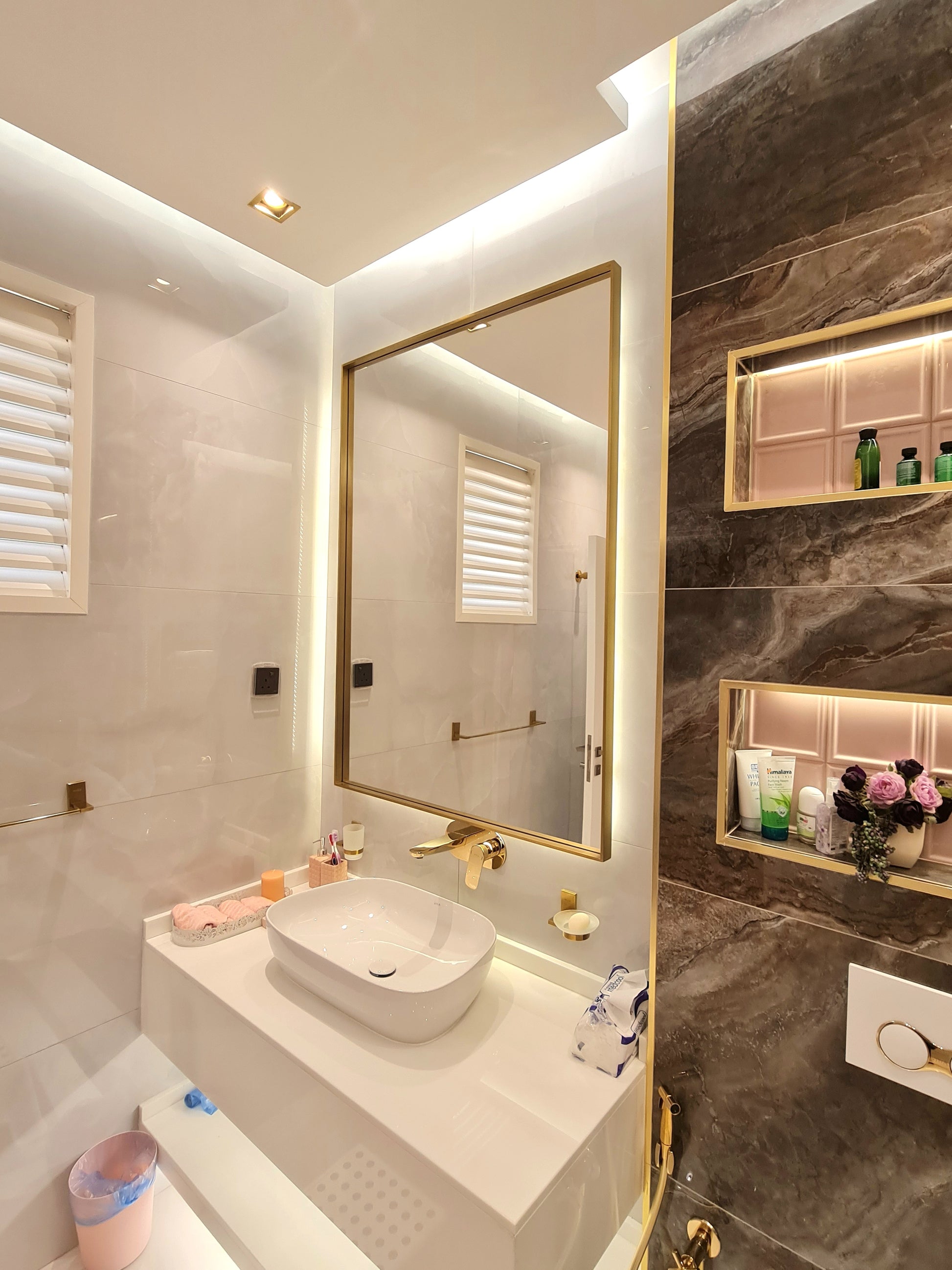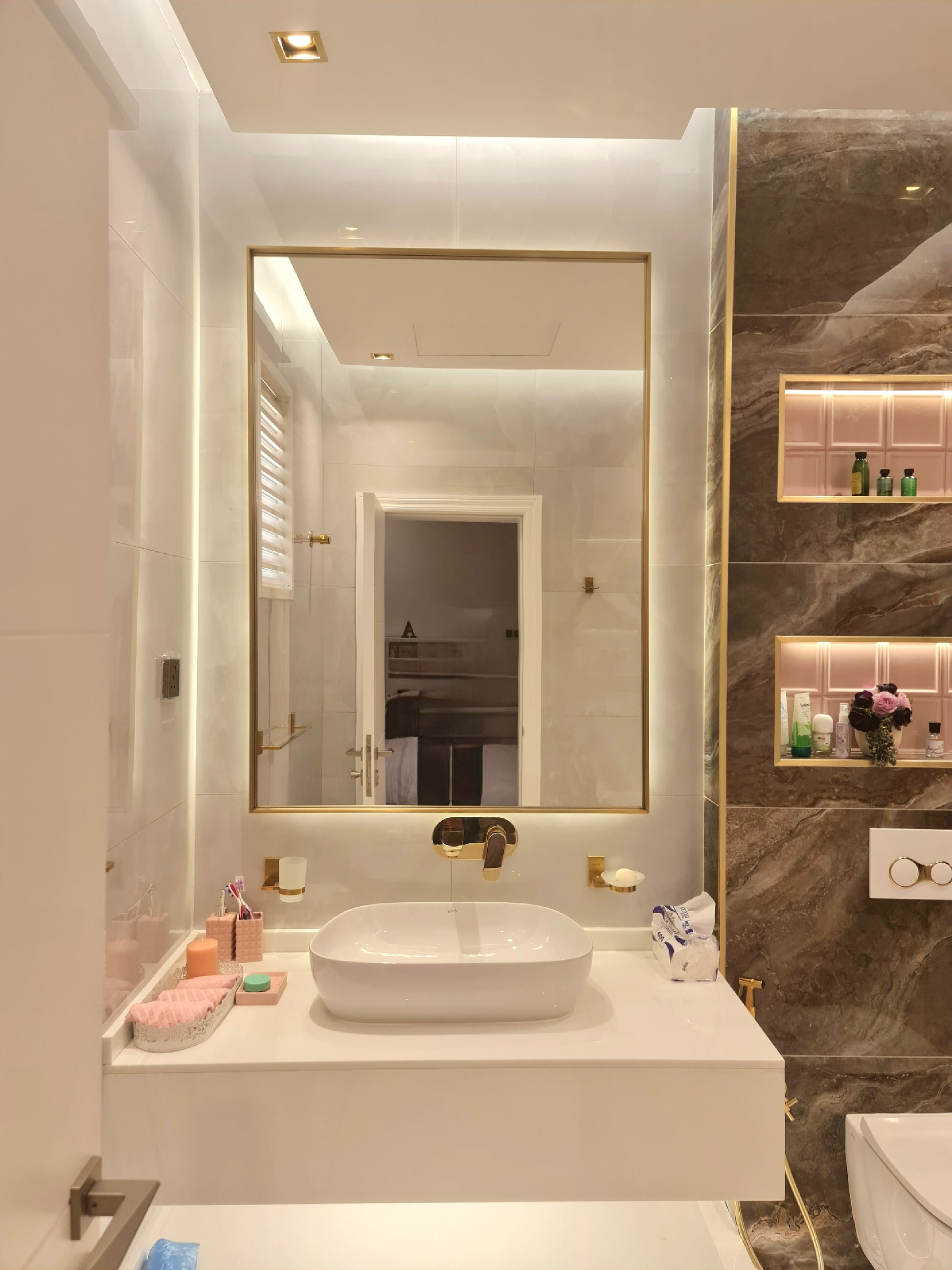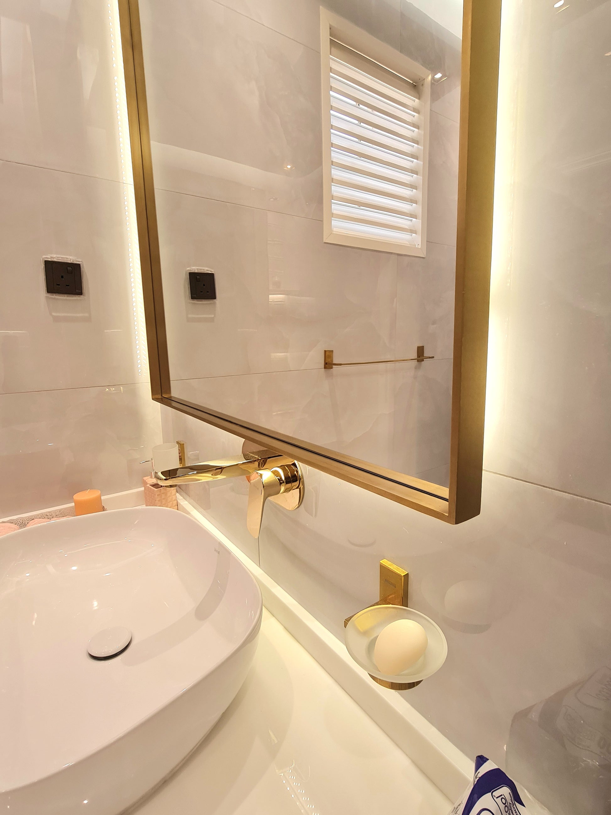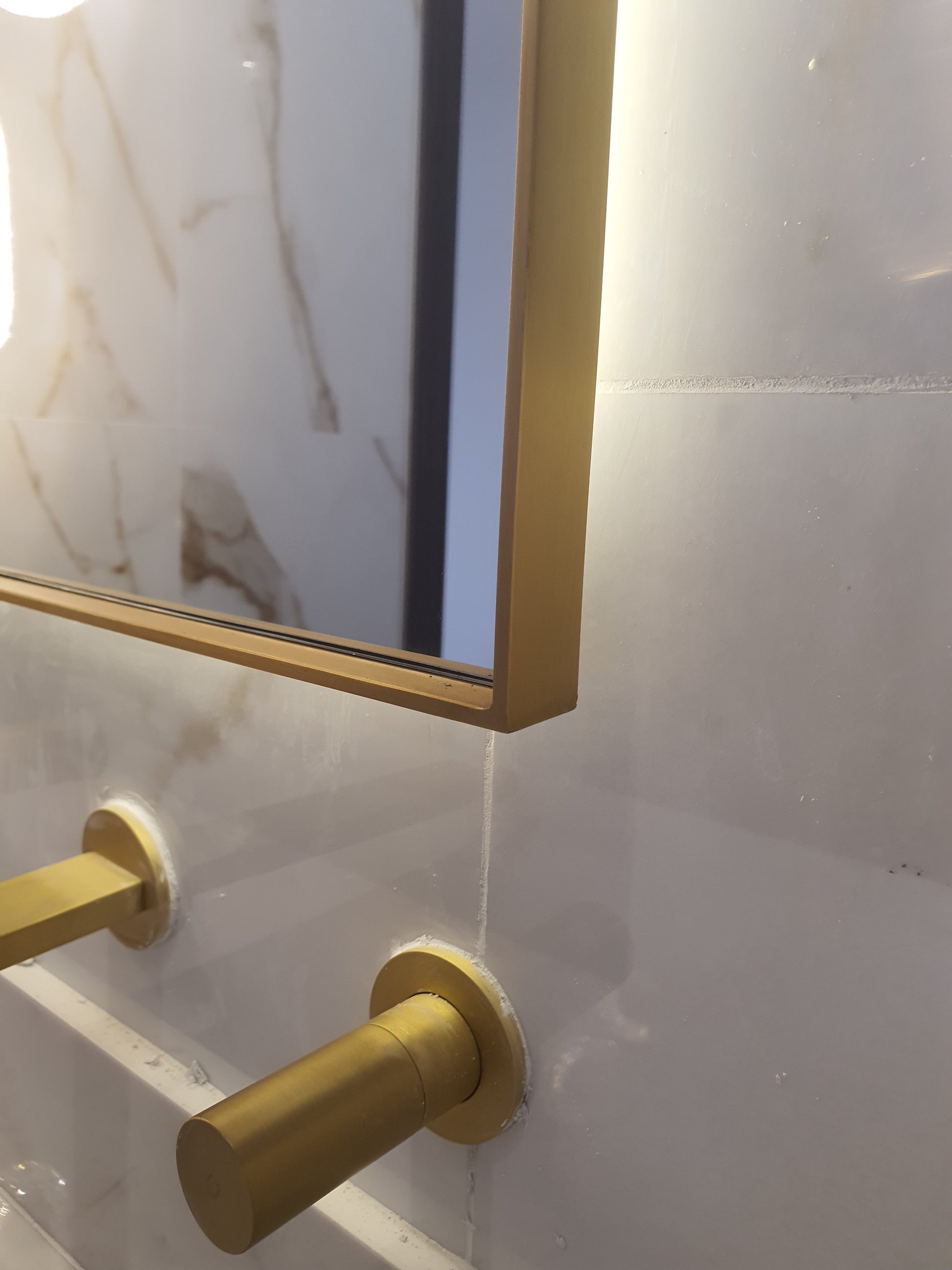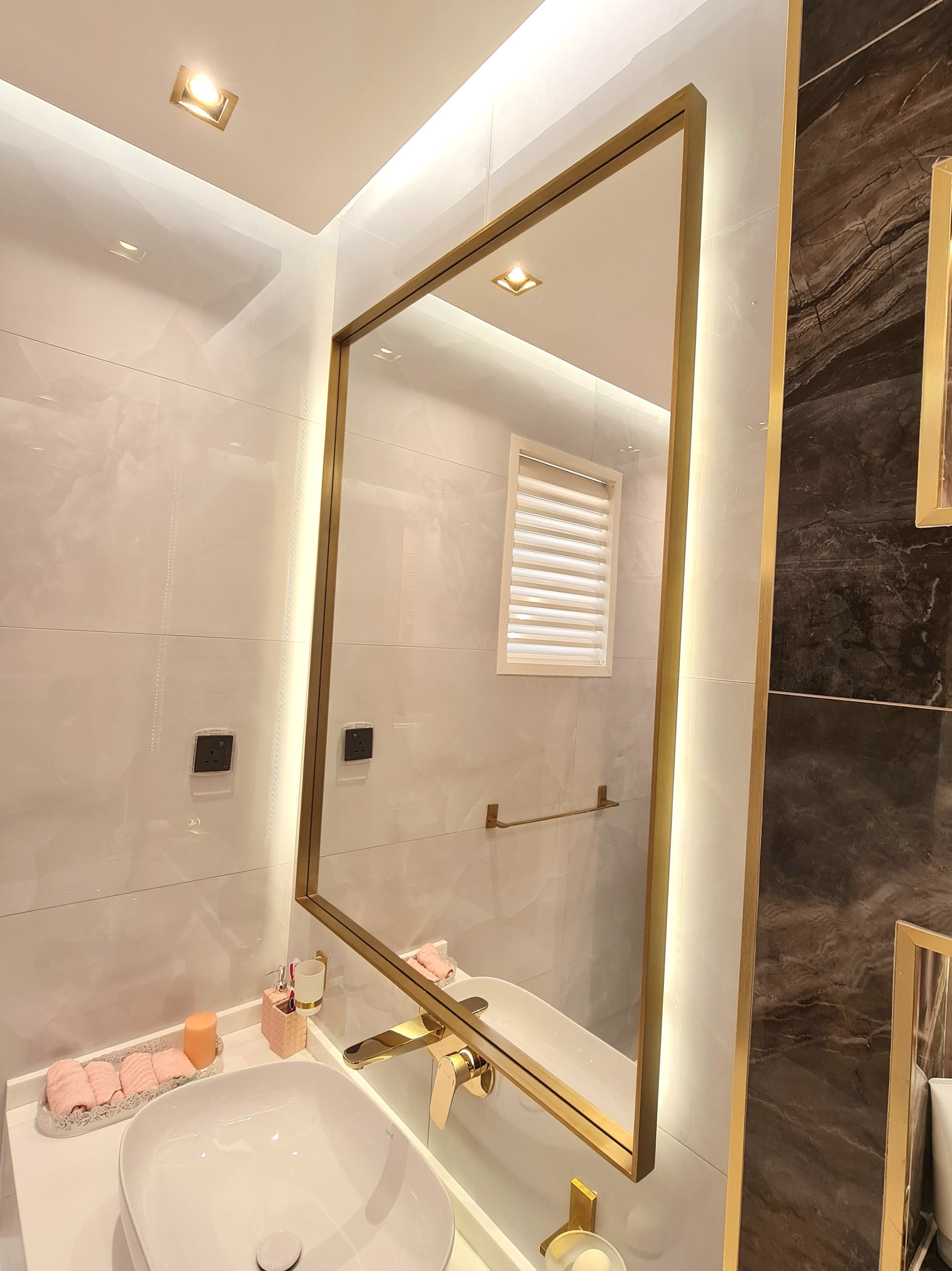 Intan mirror made of 6mm thickness Belgium mirror Double coat backing with high quality stainless steel solid frame 25x5mm thick with electroplating color. the mirror includes backlit 3000k warm white with hanging place in the back.