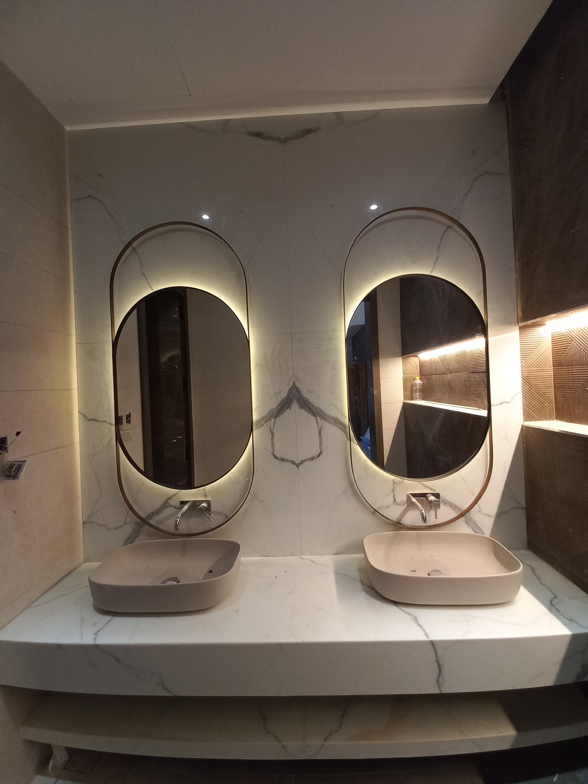 Jupiter mirror made of 6mm thickness Belgium mirror Double coat backing with high quality stainless steel solid frame 25x5mm thick with electroplating color.the mirror includes backlit 3000k warm white with hanging place in the back.